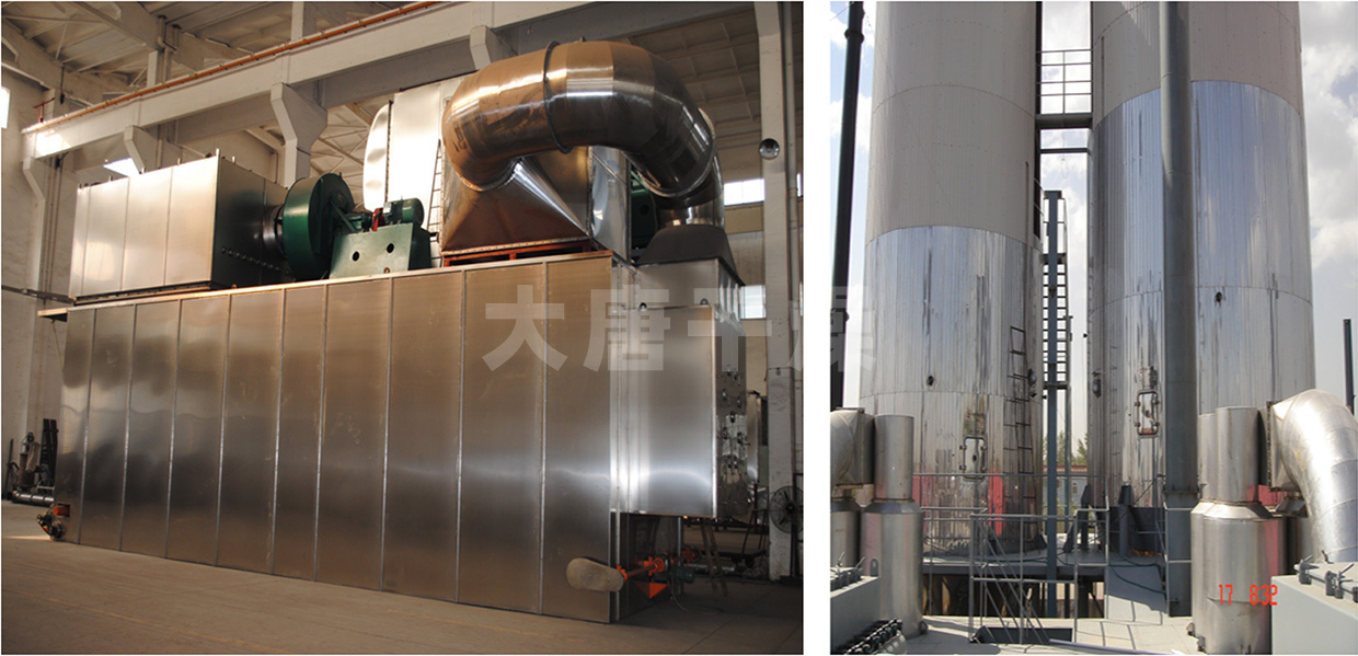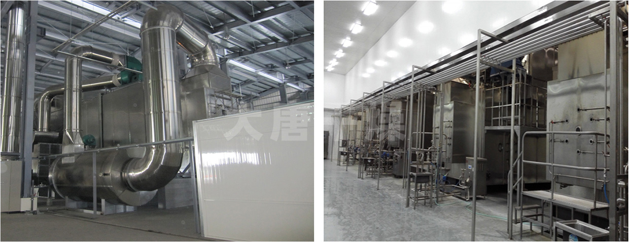 而对于卧式干燥机,对物料的雾化、热风脱水干燥、低速循环刮板粉末输送、排风布袋除尘、出粉等一系列工艺过程都在同一个紧凑的干燥箱体内连续完成,使得设备占地面积小,而高度,比如对于1900公斤/小时的卧式干燥机点只有12米。另外,对于设备内部清洗,在卧式干燥机箱体内工作是安全和容易的,只需要一台高压清洗机,工人站立着轻松操作;而在巨大的立式干燥塔内部清洗,距地面十多米甚至更高,安全性和难易程度是显而易见的。