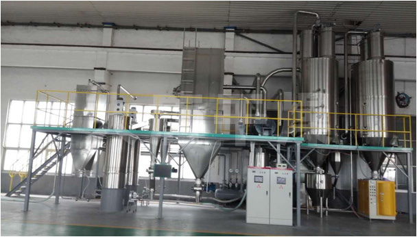 对于立式干燥机,由于垂直向下喷雾以形成雾滴的设计而导致干燥机塔体高度很高,也由于立式干燥机使用风(气流)输送粉末而必须设计使用分体的旋风分离器和布袋除尘器,这就导致立式干燥机占地面积很大,从而也要求立式干燥机的厂房高度要高、面积要大。另外,立式干燥机的粉末出料口多(塔底、旋风分离器、布袋除尘器等2-3处),同时只有细粉末才能到达的布袋除尘器,所以不同出粉口泻出的粉末含水量和颗粒度事实上是不同的!